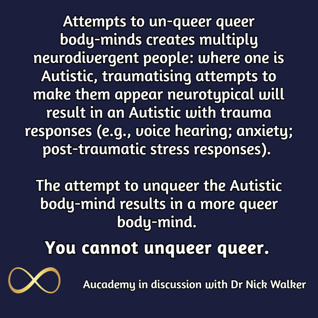 There is an consistent theme in the Autistic community that there is no such thing as an untraumatised Autistic. Kieran Rose (2021) has discussed previously how the diagnostic criteria is based on trauma behaviours, rather than Autistic experience. David Gray-Hammond (2020) has also discussed how current diagnostic criteria is based on Autistic people in distress, and as we move towards a world where Autistic people are better supported and accommodated, the criteria will need to change.