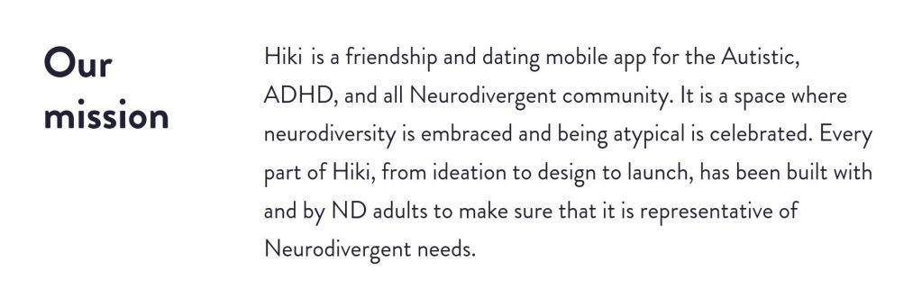 Dating is notoriously difficult for Autistic people. We are often misunderstood and misinterpreted, a clear example of Milton's (2012) double empathy problem. So back in 2019 when I was entering the world of dating again, I was pleased to find a free dating app aimed at Autistic people. While none of my matches ultimately worked out, having a space to connect with like-minded individuals gave me the confidence to ultimately meet the mother of my child. The apps name was Hiki.